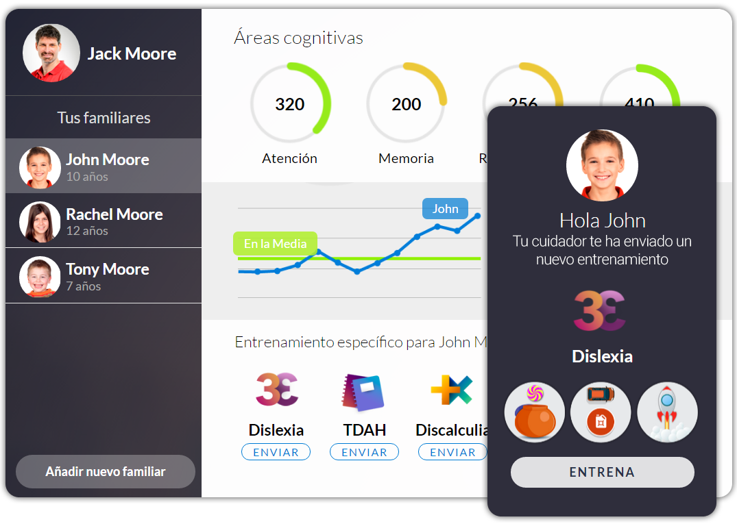 La plataforma para familias de CogniFit consta de baterías de ejercicios mentales en forma de entretenidos juegos automatizados. Esta tecnología está dirigida al entrenamiento cognitivo de las familias. Es un recurso para familias que, mediante los datos cognitivos obtenidos a través de la exploración y la estandarización de las puntuaciones en función de la edad y el sexo, permite a las familias: